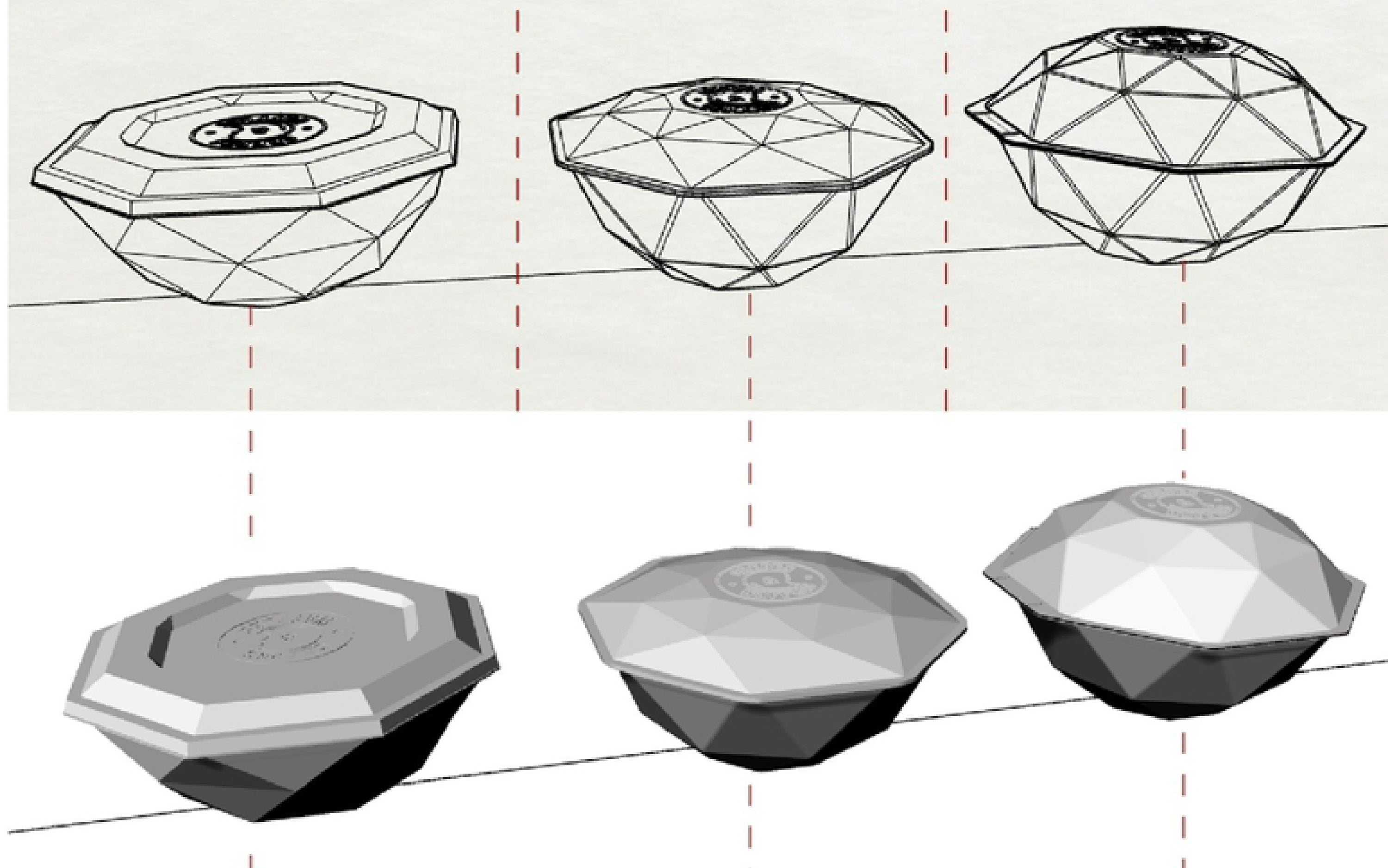 BUSCANDO DESDE LA PARTE FUNCIONAL CREAR UNA ESTRUCTURA SÓLIDA, DESDE LA PARTE ESTÉTICA EXPLORAMOS UNA FORMA DIFERENCIADORA CON LO QUE SE ENCUENTRA EN EL MERCADO DONDE EL EMPAQUE TUVIERA UN CARACTER ESCULTURAL Y DINAMICO EN SU PERCEPCIÓN POR EL JUEGO DE LUCES Y SOMBRAS QUE NOS PERMITE SU FORMA POLIGONAL